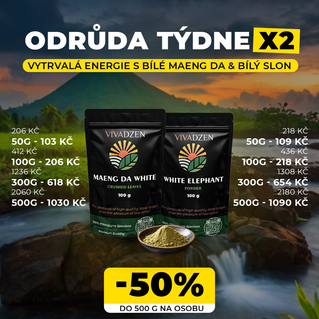 Máme pro vás skvělou zprávu! Připravili jsme pro vás slevu 50 % na vaše oblíbené odrůdy kratomu – Bílá Maeng Da a Bílý Slon.