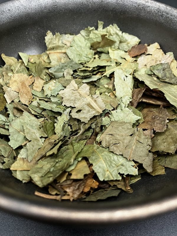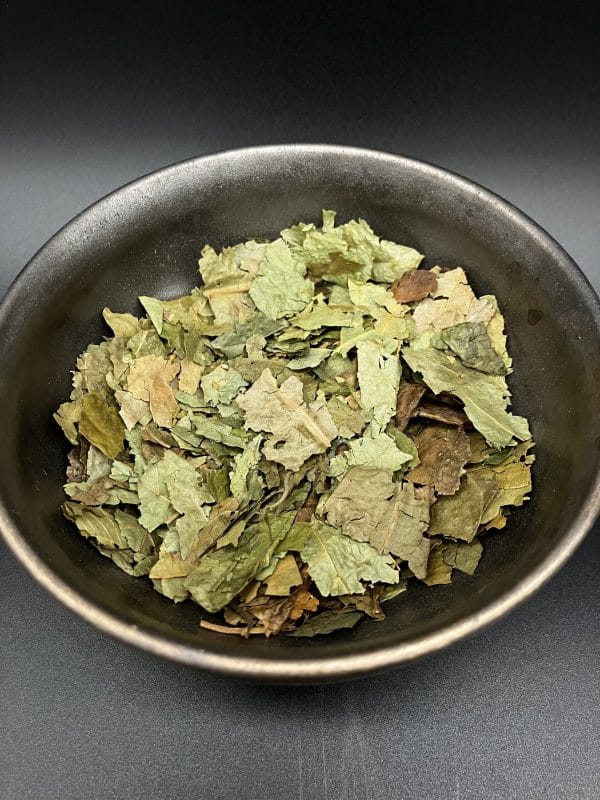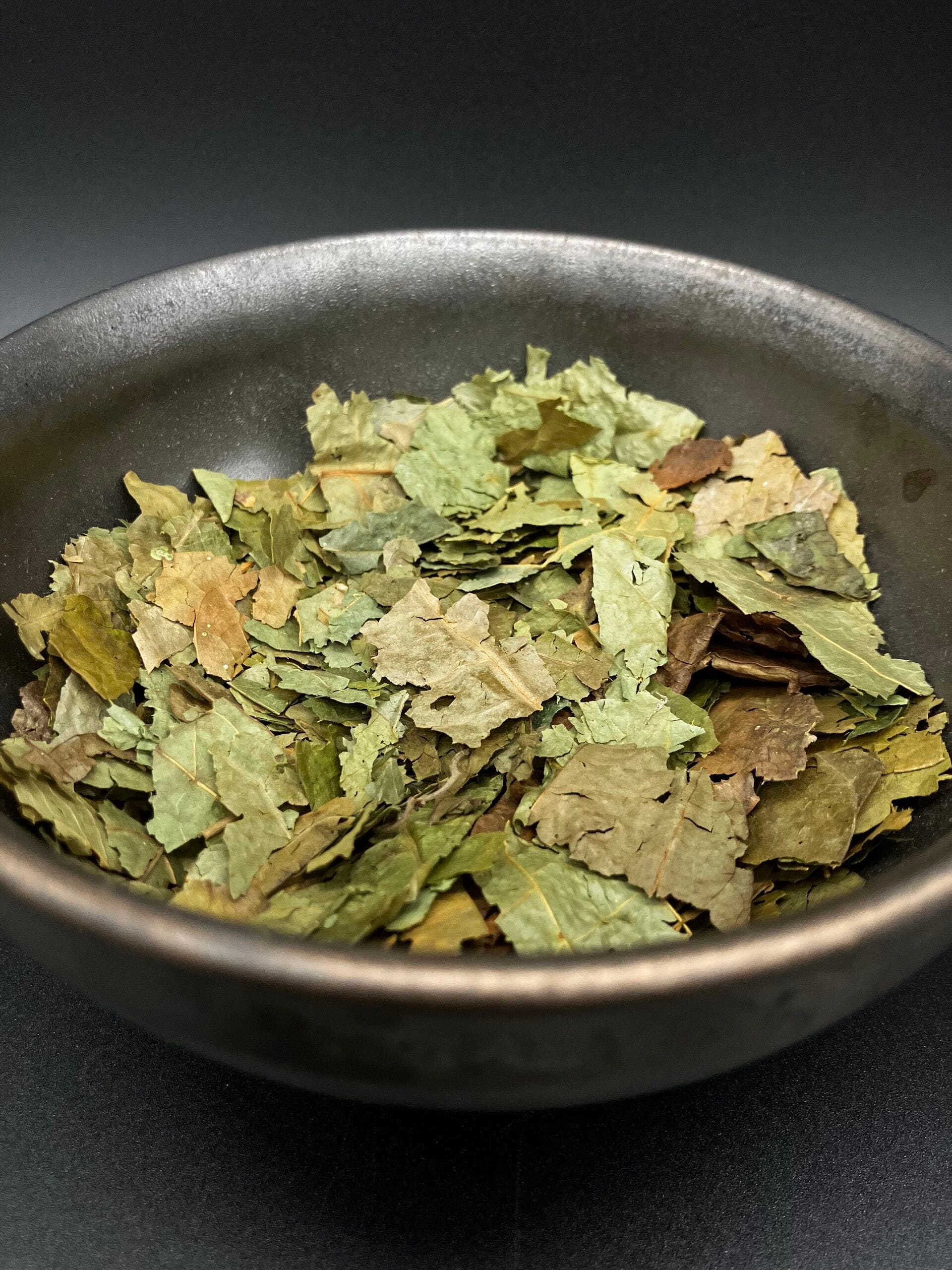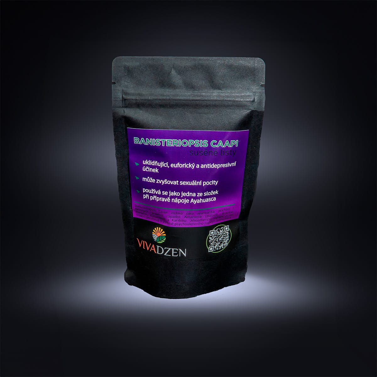 Banisteriopsis caapi is a sacred plant of Amazonian shamans, known as the „vine of spirits.“ Although the most commonly used part of the plant is the stems, the dried leaves of Banisteriopsis caapi also contain potent beta-carbolines—harmine, harmaline, and tetrahydroharmine—which contribute to the overall ritual and therapeutic effect.