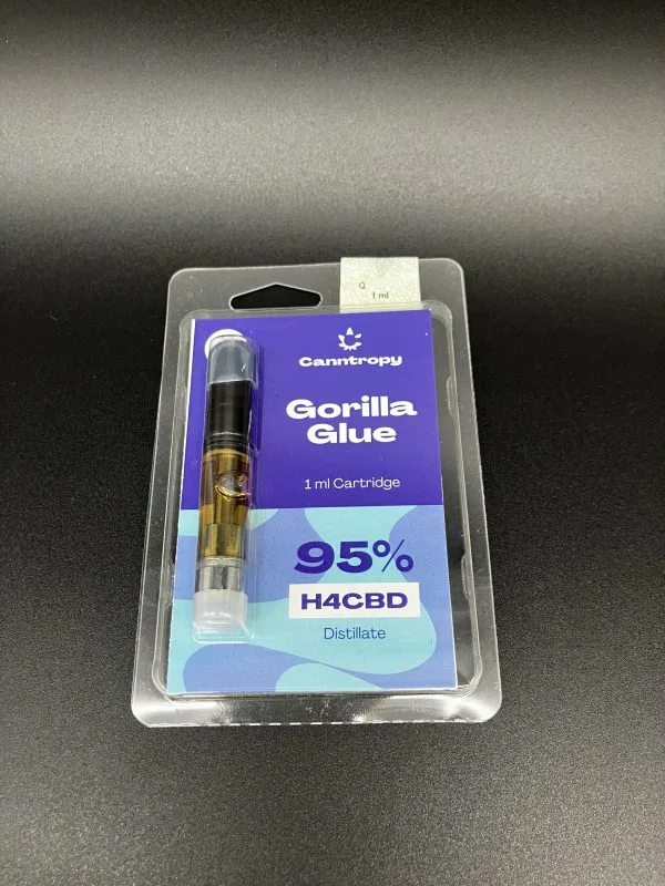 Introducing the new Canntropy Gorilla Glue cartridge with up to 95% H4CBD. This product features a 510 thread and is designed for electronic cigarettes, providing powerful effects without THC. With a capacity of 1 ml, H4CBD distillate, and added flavors, it is ideal for users looking for a high concentration of H4CBD and an excellent taste experience.