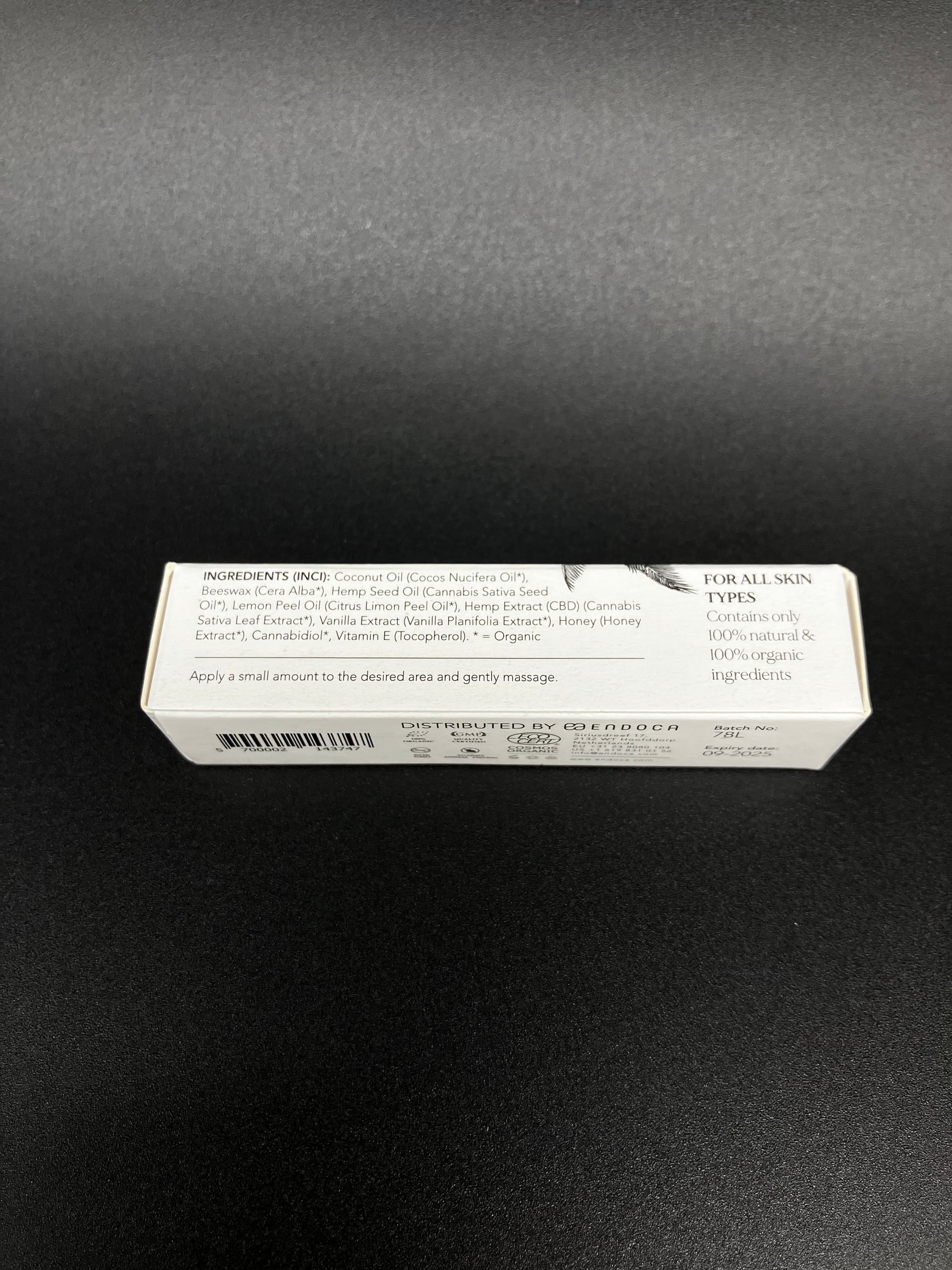 • Ingredients: coconut oil, beeswax, hemp seed oil, CBD extract, lemon peel oil, vanilla extract, honey, vitamin E