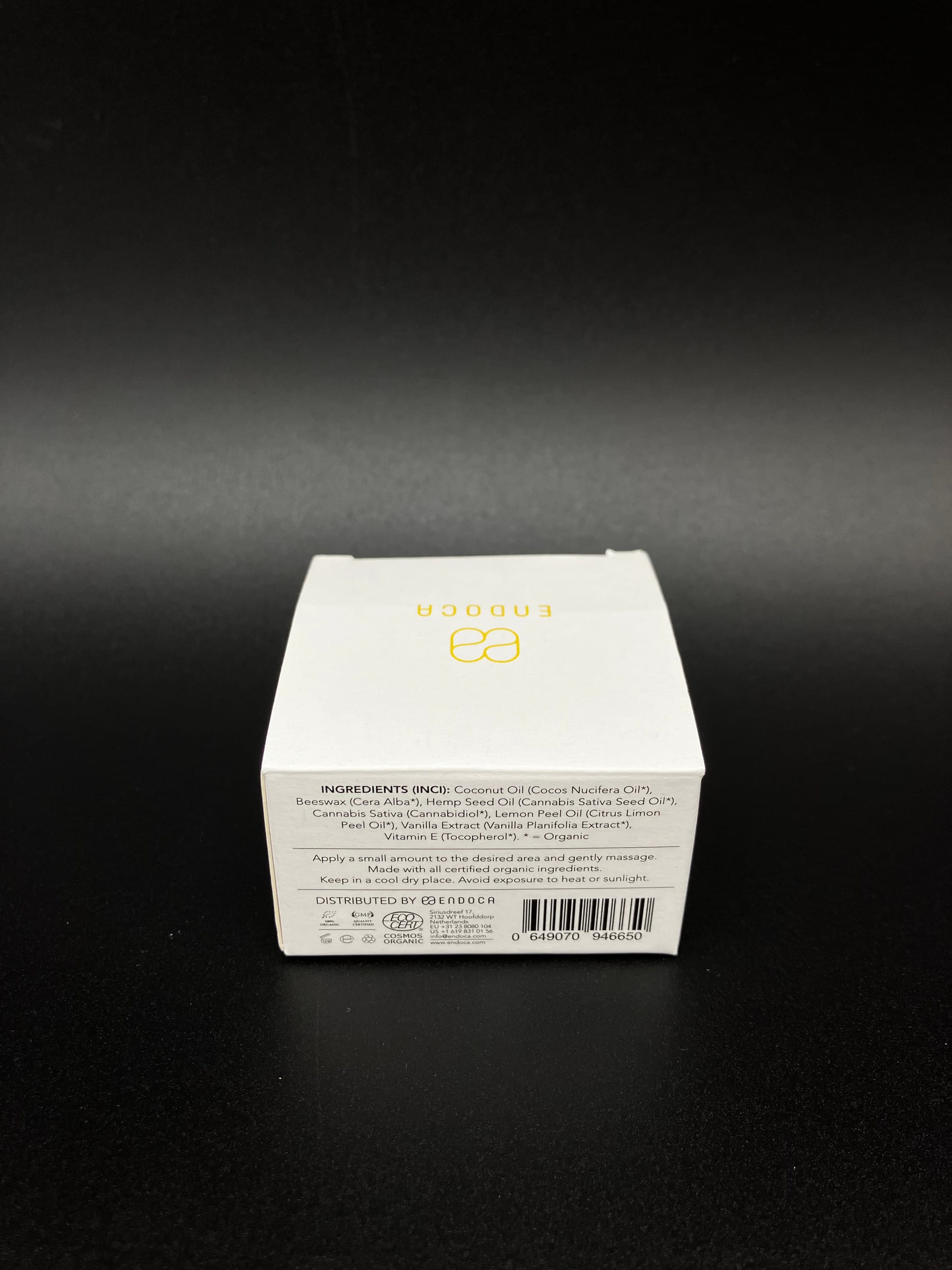 • Ingredients: coconut oil, hemp seed oil, hemp extract (CBD), lemon peel oil, vanilla extract, vitamin E