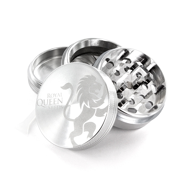 Introducing the 4-piece metal grinder from Royal Queen Seeds with a detailed engraved logo and a smooth, polished silver design. With sharp teeth, a robust construction, and an integrated filter and skiff catcher, this grinder gets the most out of every herb.