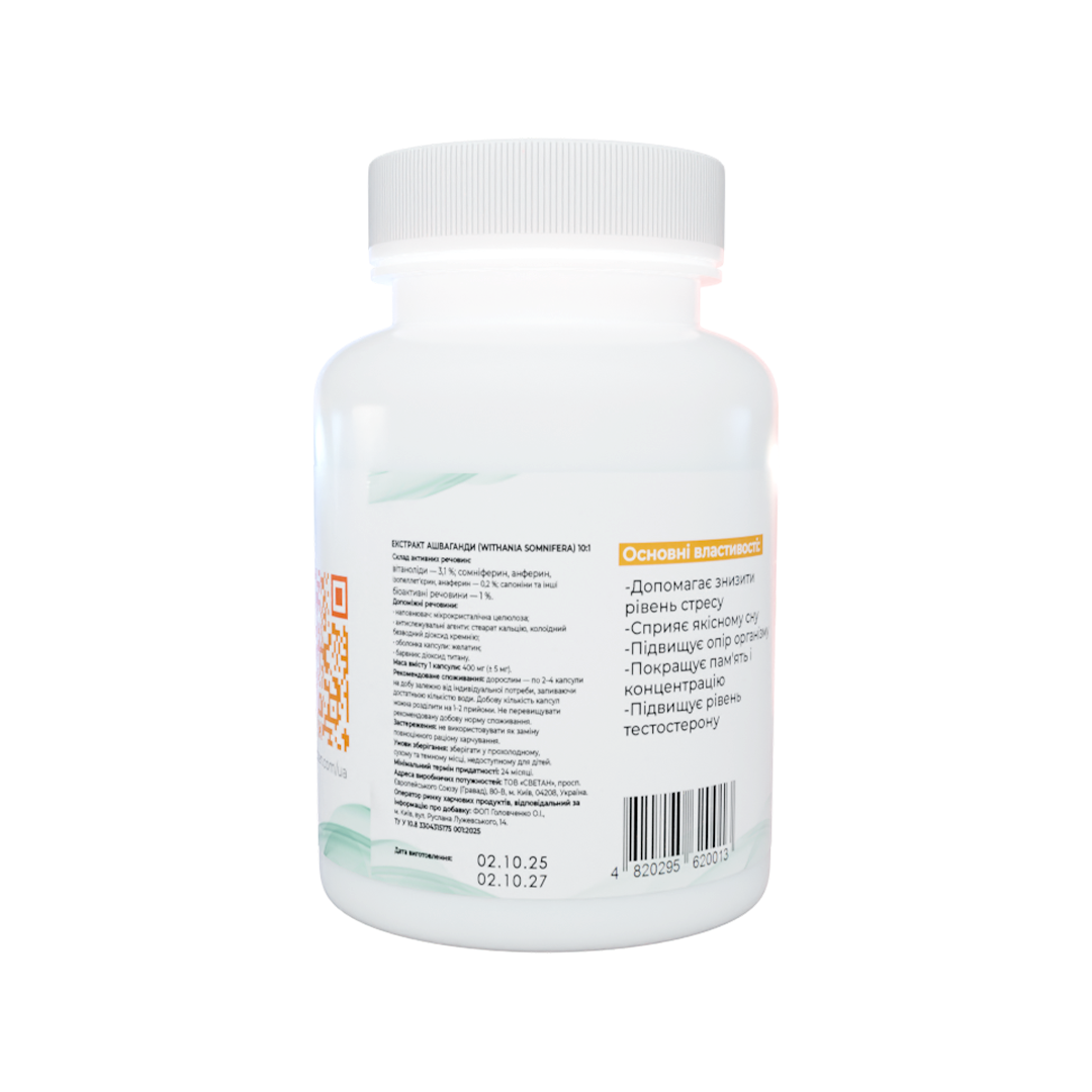 Вміст активного інгредієнта: 500 мг екстракту кореня ашваганди 10:1 на капсулу.